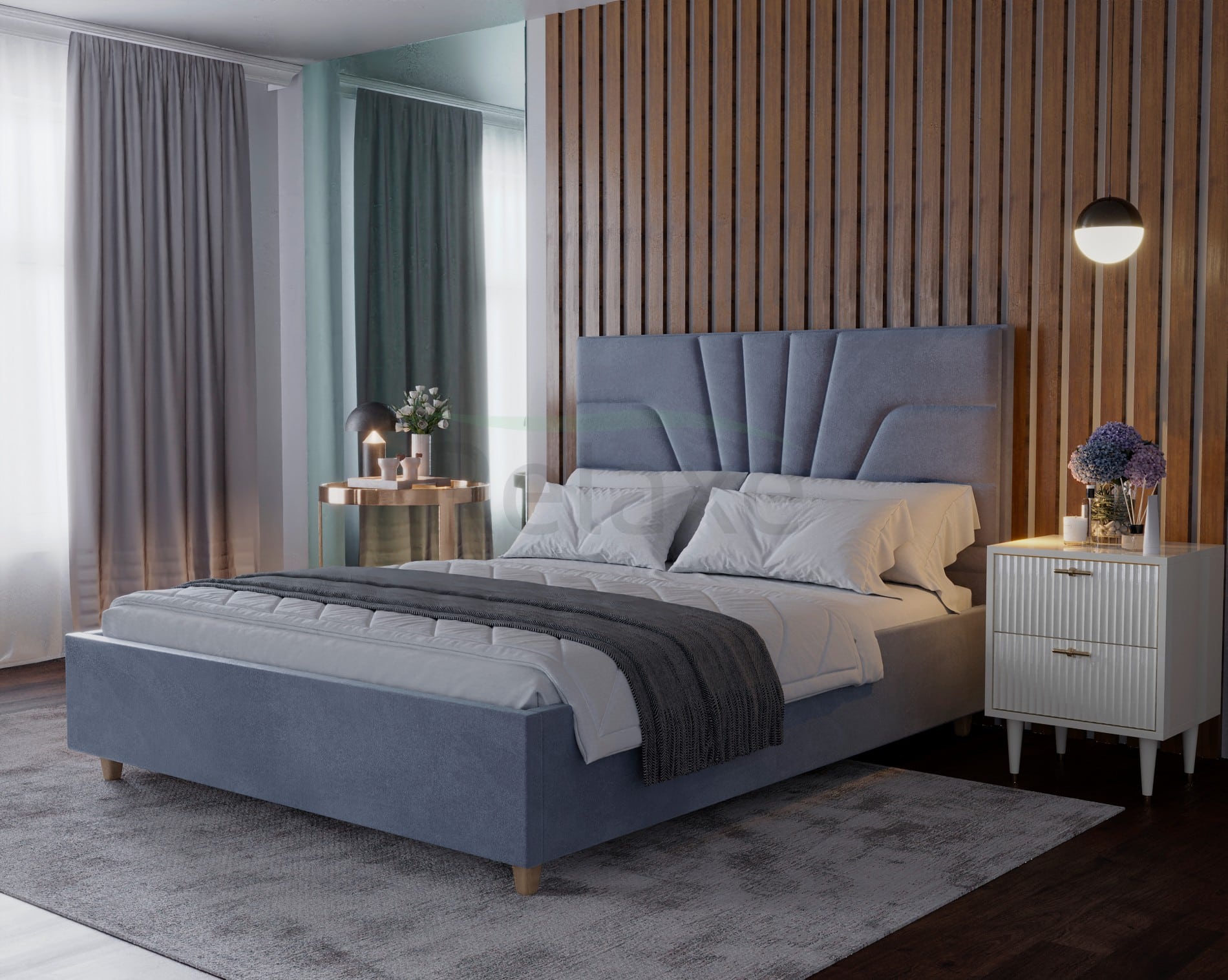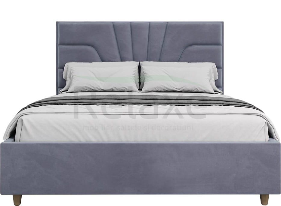 Colțurile patului sunt unite la un unghi de 90°, ceea ce facilitează procesul de producție. Tăblia are o grosime de 9 cm, iar picioarele din lemn au o înălțime de 10 cm, oferind stabilitate. Lateralele sunt realizate dintr-un material cu grosimea de 5 cm, iar cadrul patului este echipat cu 34 de lamele de 30×30 mm, asigurând un suport optim.