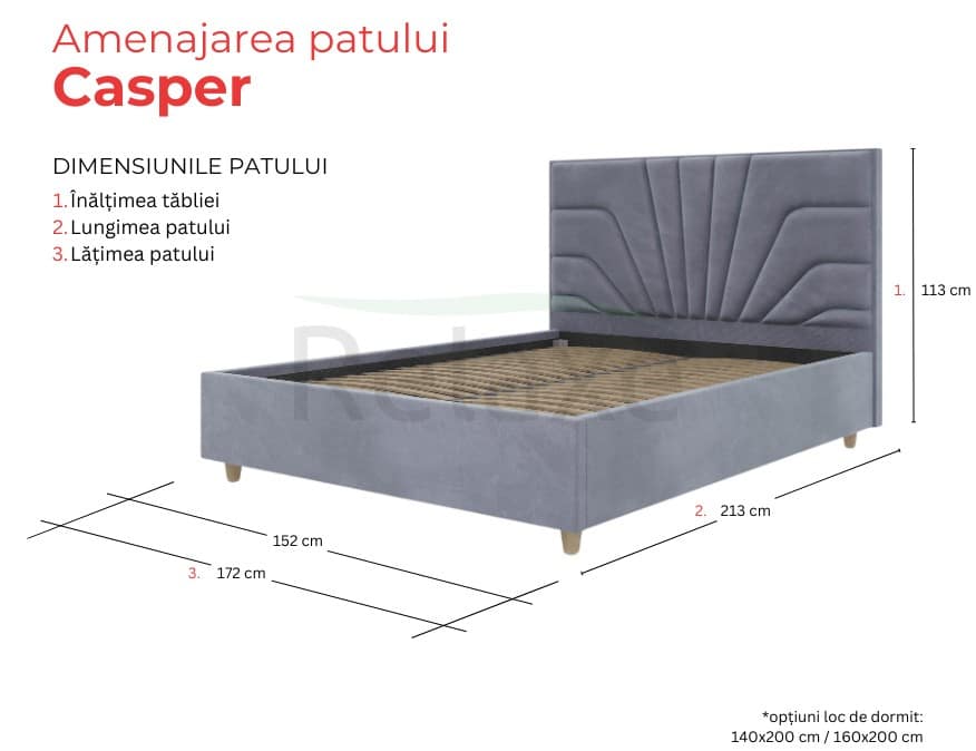 Patul „Casper” face parte din gama „Econom” și este disponibil în două nuanțe standard: gri și bej. Acesta nu include ladă de depozitare sau mecanism de ridicare, fiind un model simplu și eficient. Țesătura „London” folosită pentru acest pat este rezistentă la uzură și deosebit de durabilă.