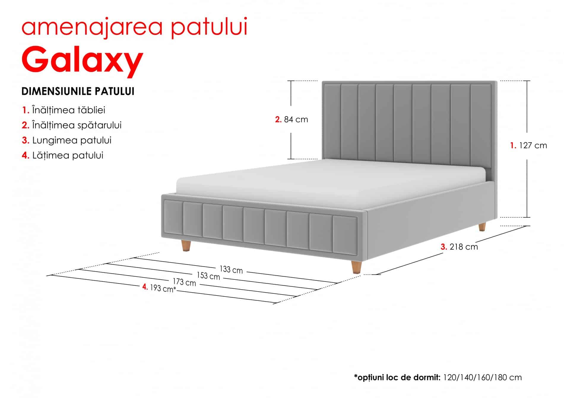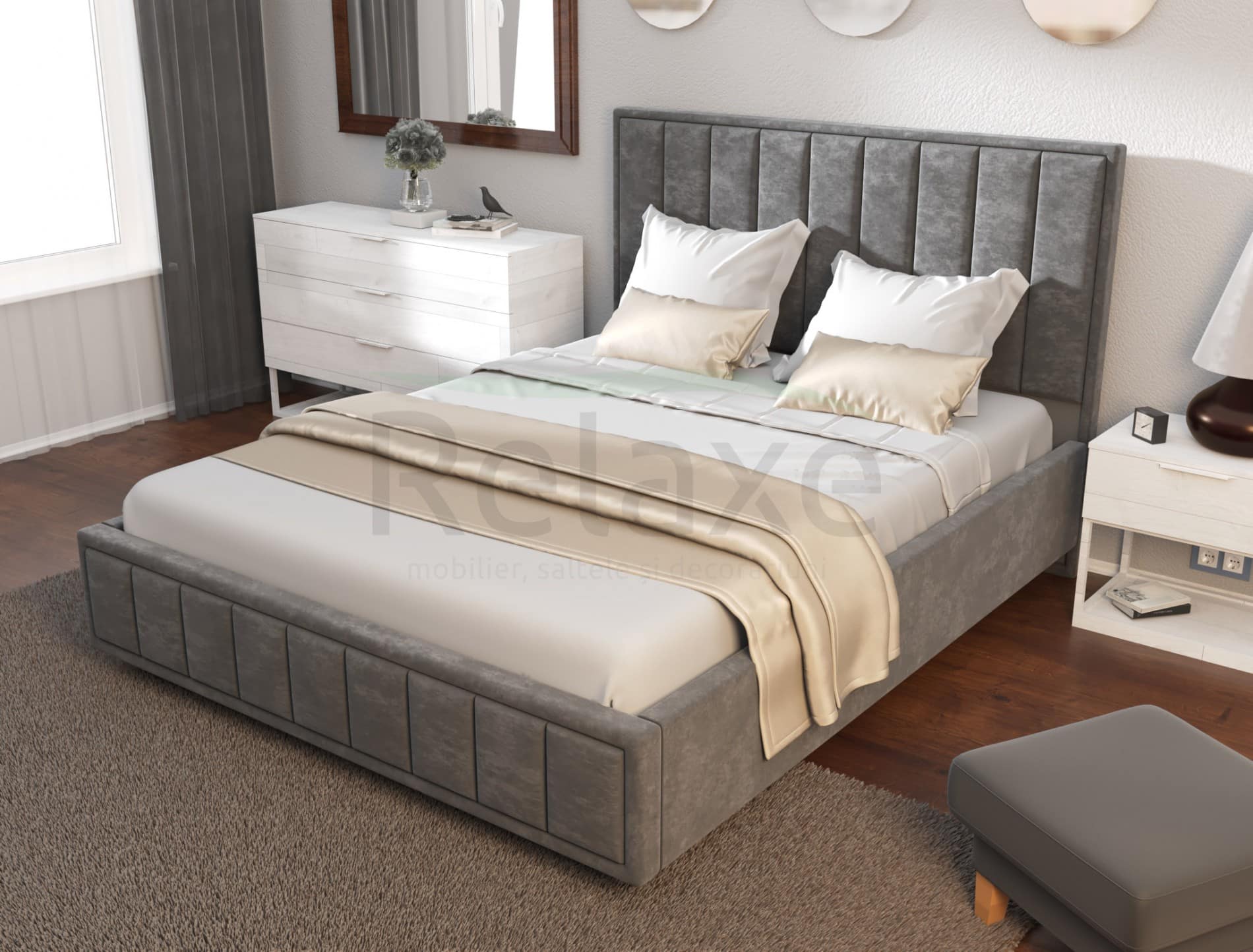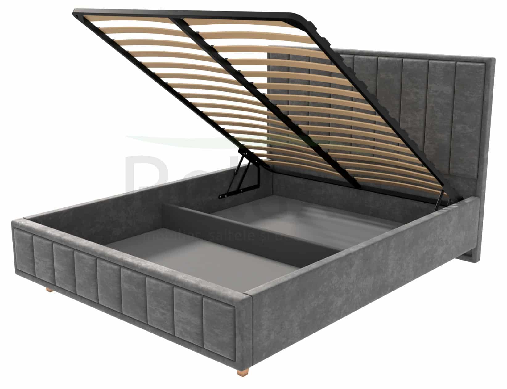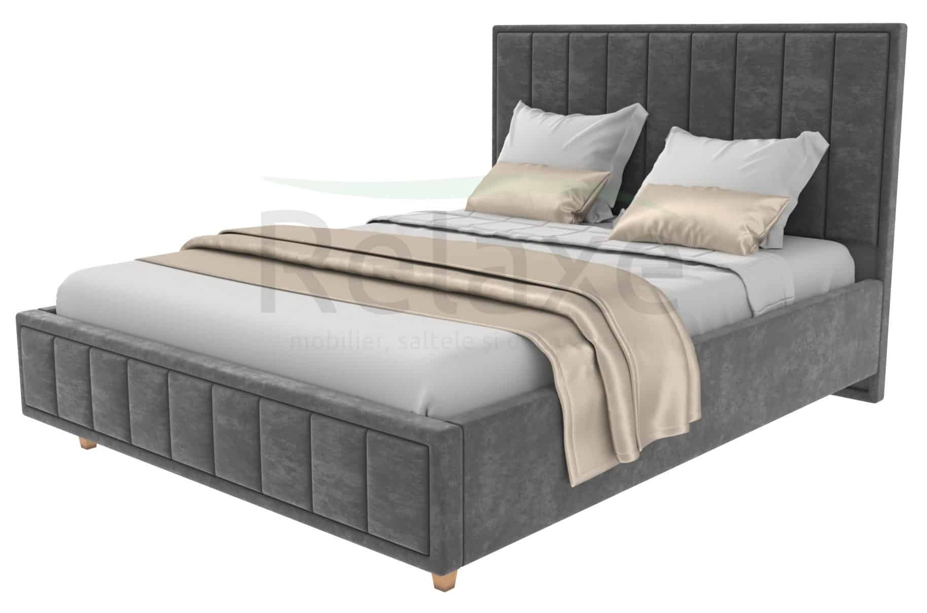 Explorează eleganța cu patul nostru, tapițat în stofă rafinată sau eco-piele la alegere. Cu un mecanism de ridicare ingenios, o ladă spațioasă pentru depozitare, lame premium și o tăblie stilată. Gama variată de culori în stofă și eco-piele oferă libertatea de a personaliza. Dimensiunile personalizate completează atmosfera de confort. Transformă-ți dormitorul într-un spațiu personalizat și rafinat!