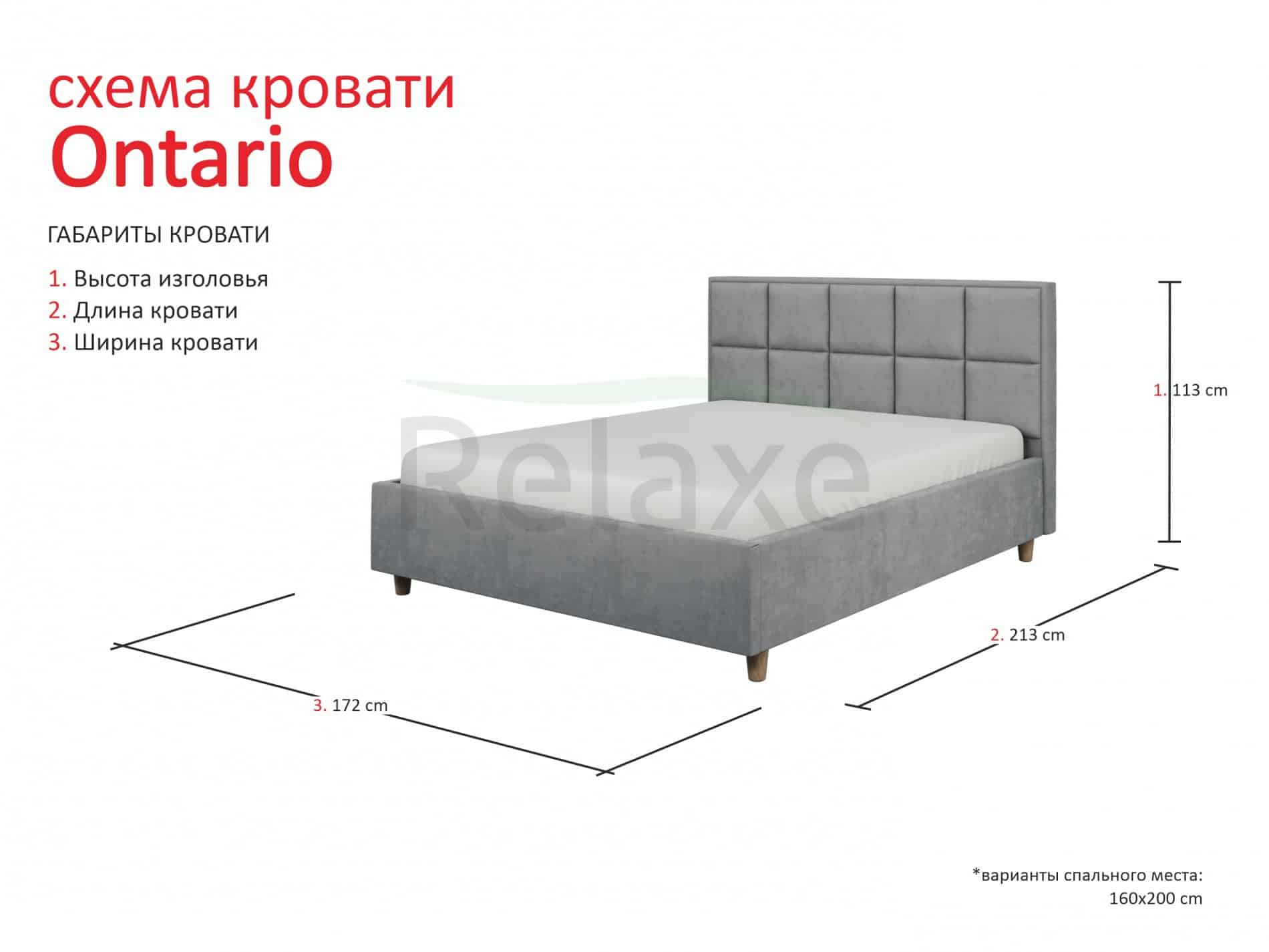 Patul “Ontario” face parte din categoria „Econom”. Acest model este disponibil în mai multe nuanțe standard pentru pat: gri, bej, cafeniu. Modelul include sertare pentru depozitarea lenjeriei de pat cu funcție de aerisire și mecanism de ridicare a patului. Se folosește țesătura „Balaton”, rezistentă la uzură și durabilă.