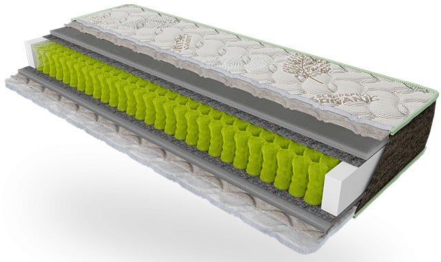 Sleep&Fly Epsilon Organic cu bloc de arc independent Pocket Spring. În acest model, blocul cu arc este implementat sub formă de clepsidră. Semnificația lor este că atunci când greutatea nu este mare, partea superioară mai moale a arcului „funcționează”, iar cu o greutate mai mare, partea centrală mai rigidă „se conectează”.