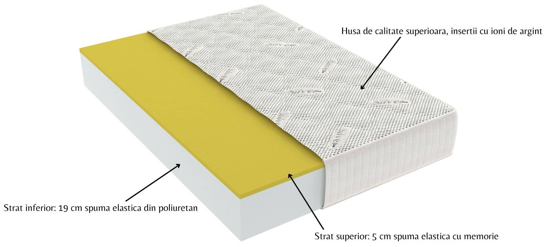 - 5 cm spumă elastică memory, densitate 40 Kg/m3, duritate 18